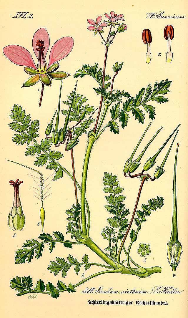Fruto con pico espiralmente retorcido 1-7 cm. Florece de febrero a octubre. El fruto lo forman 5 mericarpos indehiscentes de entre 5 y 7 mm.